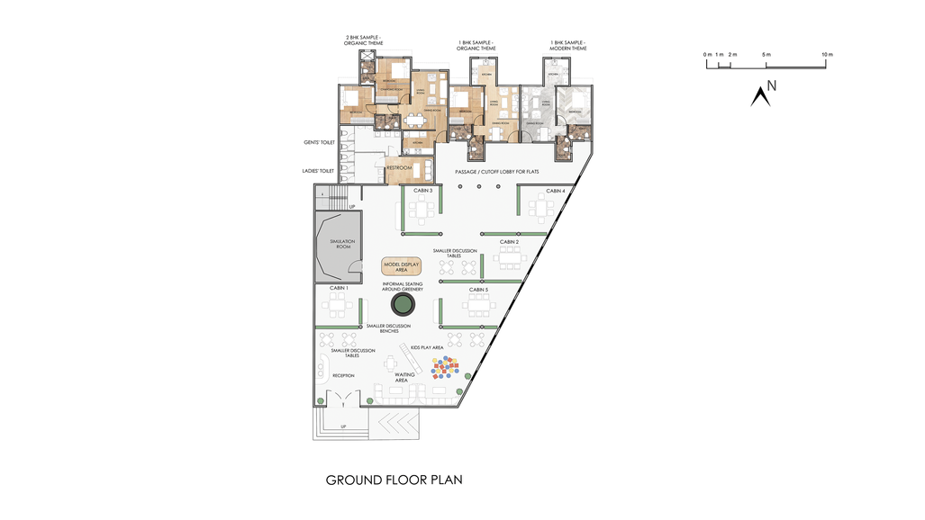 The experience centre is planned to be extremely legible and wall – free, such that every space can be clearly understood and accessible from every point in the space, making it more convenient for functioning. However, it is essential to divide spaces as well for carrying out various activities and functions. Small, eye – level partitions are used to divide spaces, and columns are used as demarcators of spaces. White is highly welcoming to visitors, and gives a very sleek and modern look to an office space. As a result, alucabond is intensively used to clad the interiors. Artifical greenery is used to make the space more peaceful and welcoming, and it blends well with the natural light from the atrium. The planning of the space is also done by understanding the way a user would use the space, providing maximum legibility, efficiency and ease of movement, a better experience as well as maximum privacy to the office users.