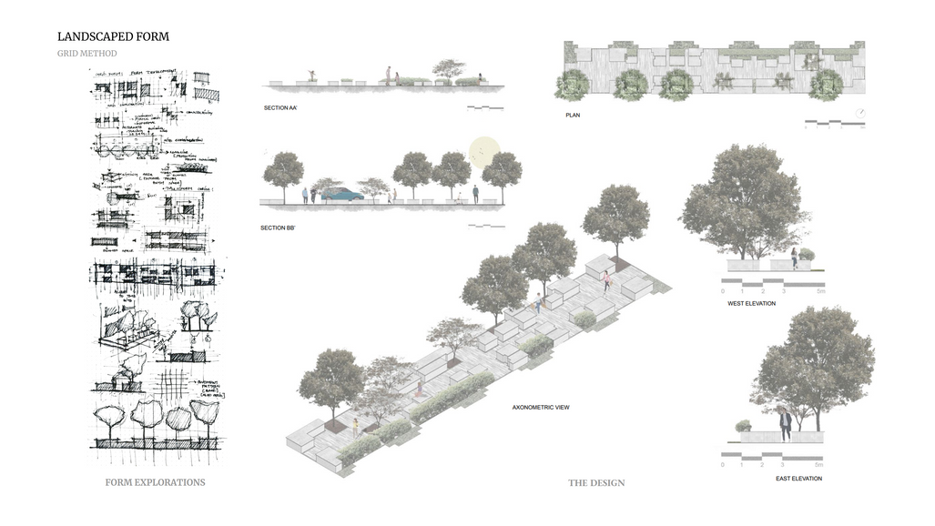 The basic aspect to express my narrative was to have open access and seatings on most of the sides so that there's no crowded spots in the design and also to have a minimal but effective approach in terms of the design. The tree plantation and the overall landscaping was an important aspect to look at because of the existing college. The windows facing on the front side were to be noted because the overall plantation moved around it. Here the thought was to place trees which will work out as a canopy providing shade to the users.