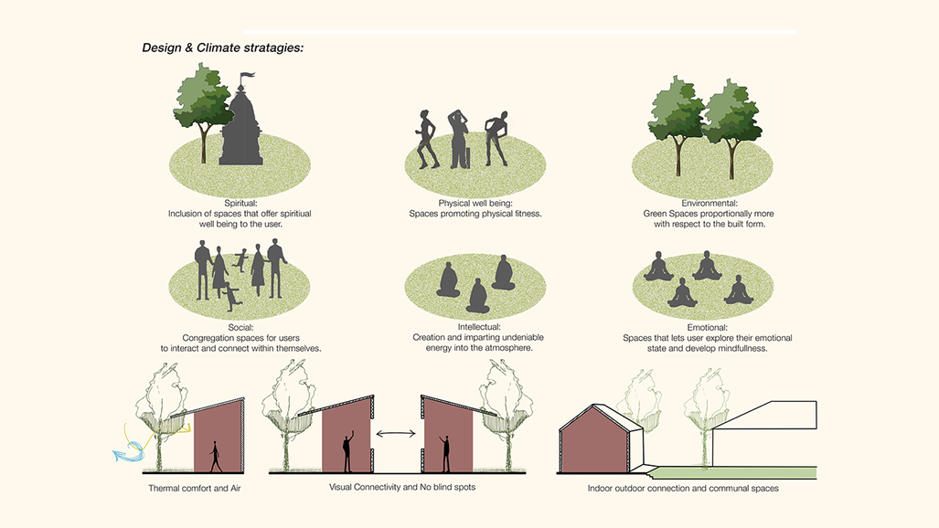 A Wellness center is a very essential part for people in this urban society due to the integrated health solutions they provide to both mind and body. Location plays a very important part in the making of any wellness center. Here, our location is the city of Alappuzha in the state of Kerala, India. As this city is located near the waterfront, it creates the perfect setting along with the tropical climate. It is a place with less amount of population that adds up to the beauty of the site and the overall motive of this project. We start with the basic idea of proposing such spaces that respond to such a setting and are designed to allow the maximum amount of natural light and ventilation. All the buildings are centered with a courtyard and many green pockets that create breathing space and a kind of openness in the plot. There is an emphasis on earthy elements such as the use of stone, timber, natural fences. The horizontal expanse of the structure is well balanced with the verticality of the planes formed by the diverse vegetation. We are also proposing congregation spaces for users where they could get some hands-on experiences and help them connect more with nature. Along with this, things like comfort, accessibility, and aesthetics are equally paid attention to. The path gradients are very carefully calculated to minimize fatigue and provide subtle pause points. Gardens are proposed to encourage walking as a form of exercise and act as a barrier from urban noise and smoke.