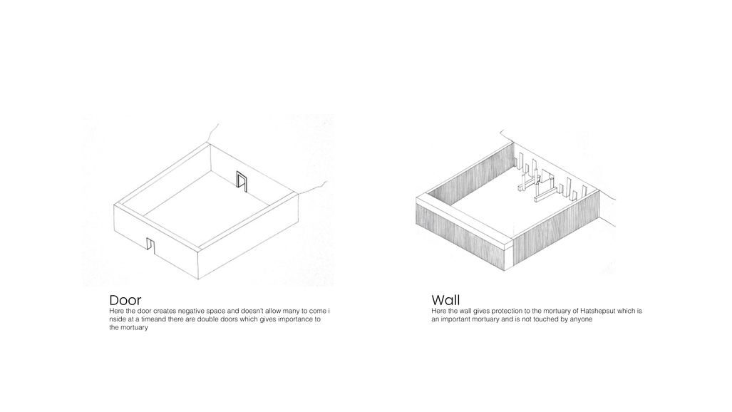 In our day-to-day life, we see many spaces but we often don't know how these spaces are built by elements like - Columns, Floors, Walls, etc. This project helped me understand how different elements are used in a building to make up the space. In the Asiatic Library, the Floor is used as a space for support and stability. Steps act as a strong and rigid element and are used for movement. The column is used as a movement guide and for support as well. The door and roof functioned for their purpose. In the Temple of Hatshepsut, walls act as a protection to the mortuary inside. Columns act as rhythm. all of this was identified by drawing diagrams for it.
