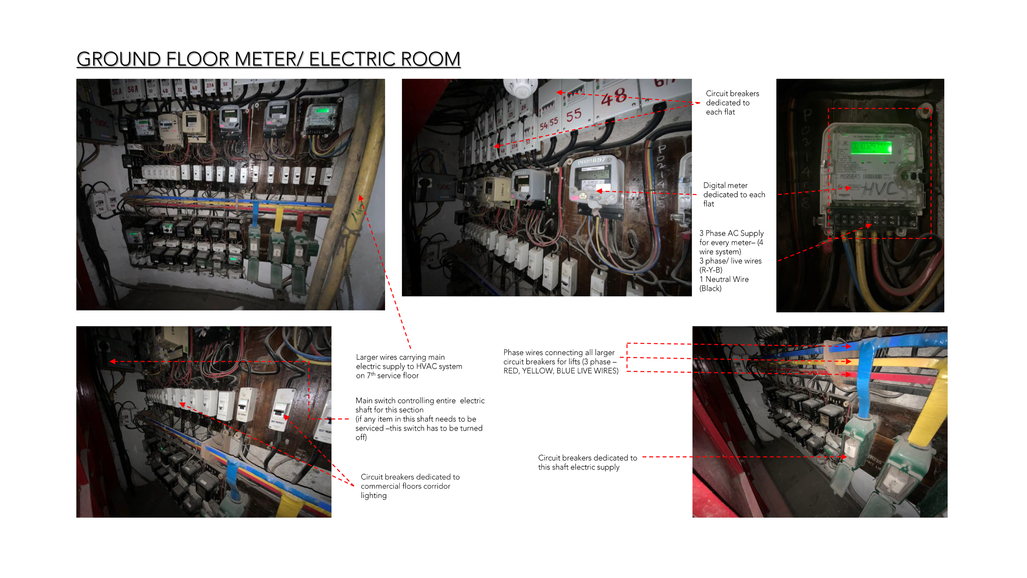 This project is a photo study of the electrical service system & its components, in our residential building and in our own house. The process of identification of the sub-station and transformers to know their current carrying capacity. The path of electrical lines followed from meter room to various systems such as, fire fighting systems, lifts, building compound lights and most importantly into electrical ducts for distribution into the house.
